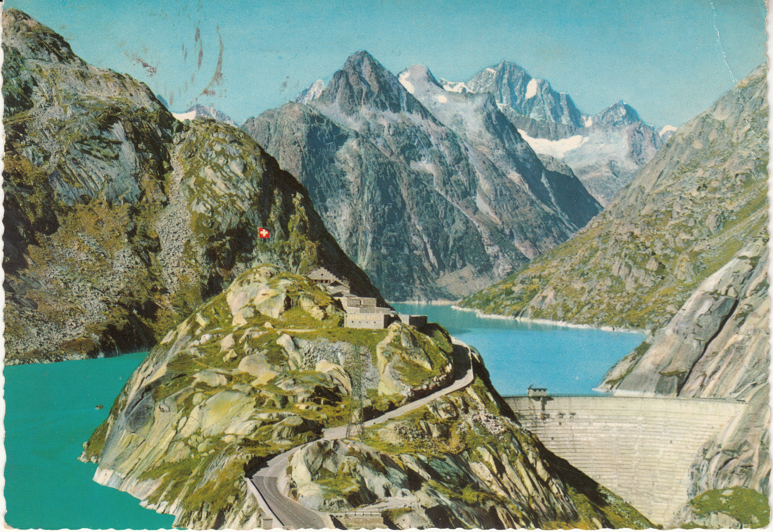 GRIMSELPASS (2165 m) Lake and barrier with Hospice (1875 m)
