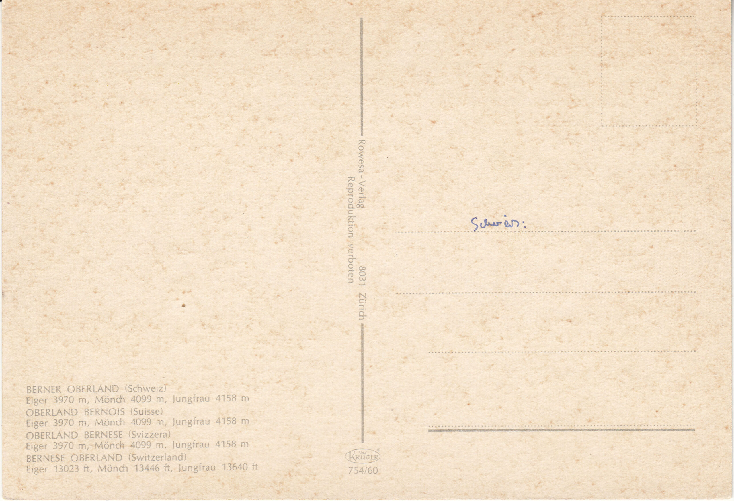 0.754- 17 Krüger Postcard Switzerland