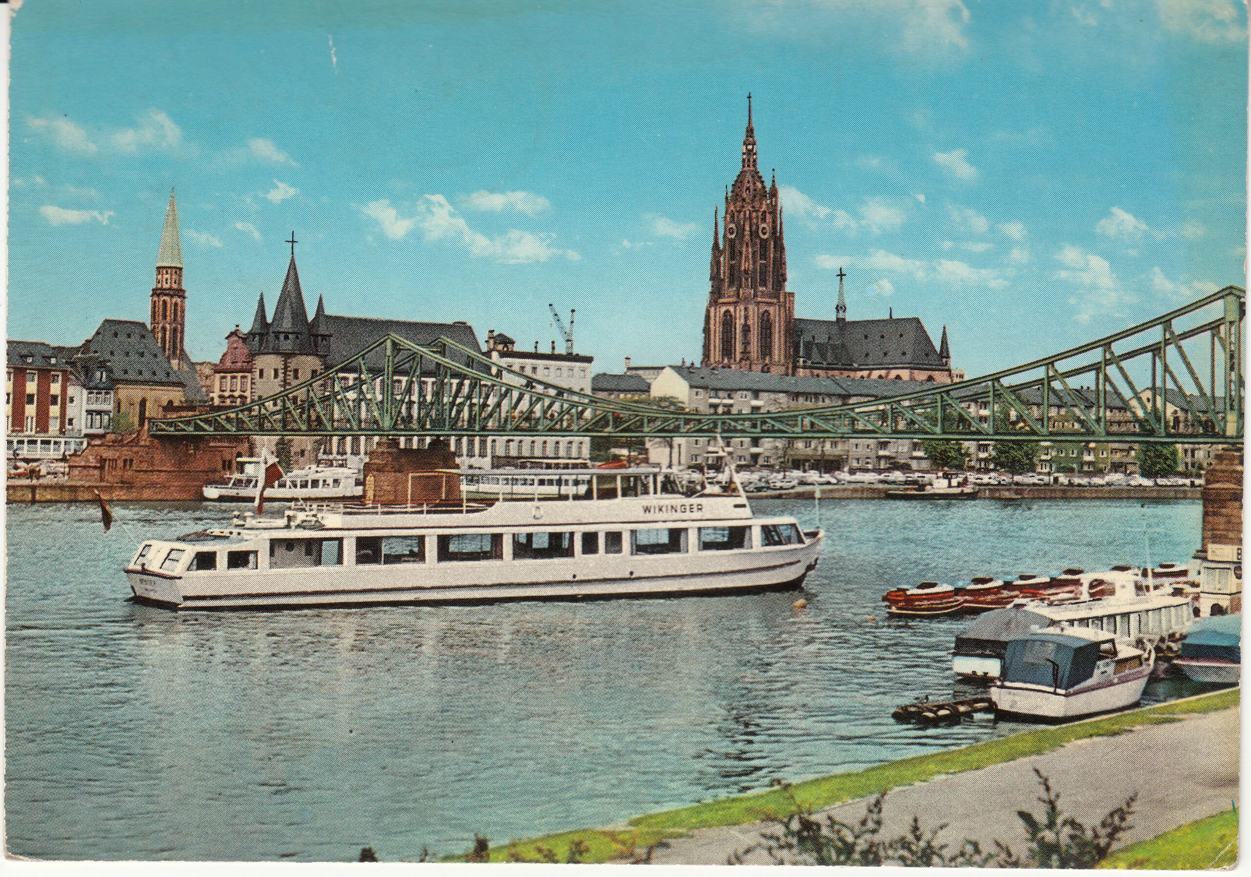 Fahrgastschiff “WIKINGER” auf dem Main in Frankfurt mit Eisernem Steg, Dom, Rententurm und Nicolaykirche