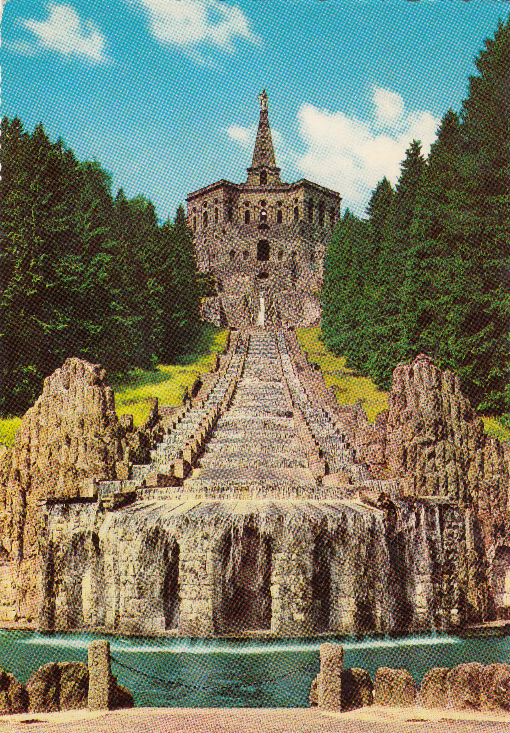 KASSEL-WILHELMSHÖHE, Herkules mit Kaskaden, Erbaut 1701-1717, Gesamthöhe: 69,70 m, Länge der Kaskaden: 250 m, Höhe der Figur: 9,70 m, Breite der Kaskaden: 11,50 m, Gewicht der Figur: 2,850 t, Zahl der Stufen: 885