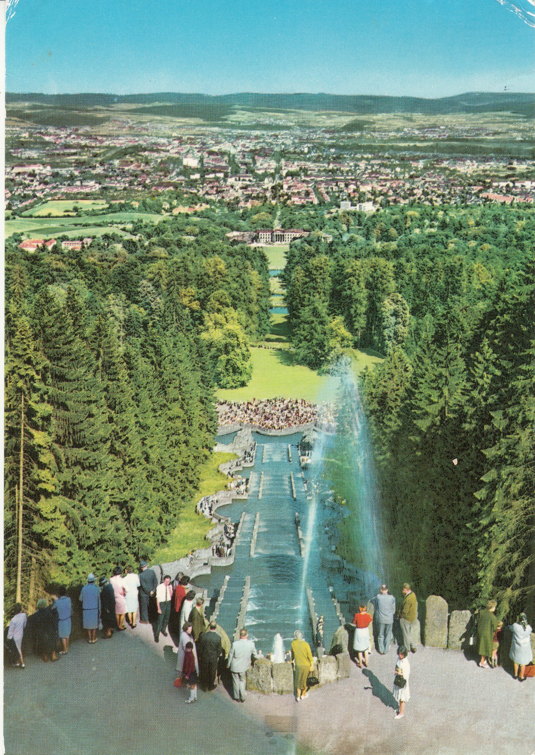 KASSEL-WILHELMSHÖHE, Blick vom Herkules auf Kaskaden, Slcloß Wilhelmshöhe und Stadt