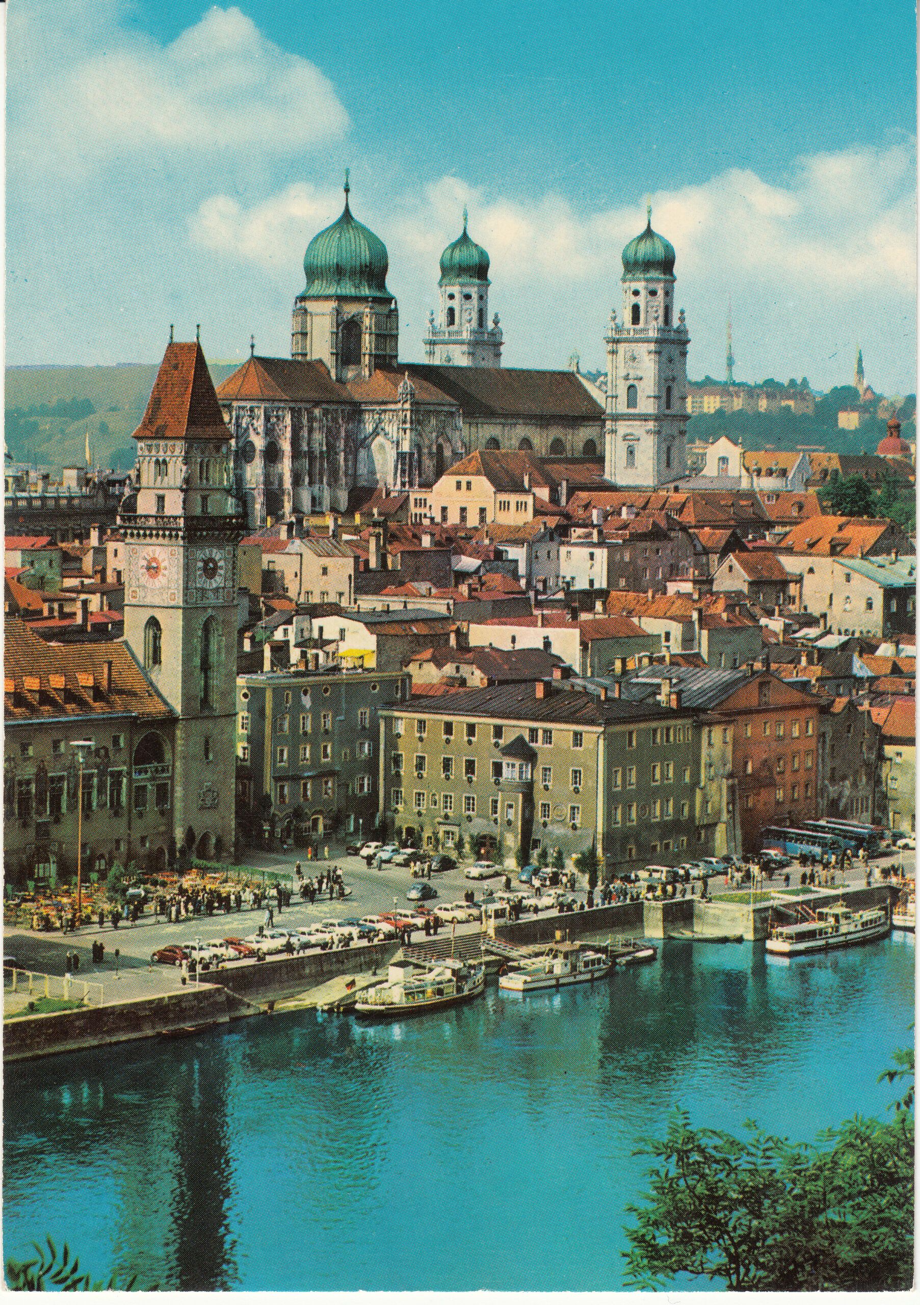 PASSAU, Donaupartie mit Blick auf Rathaus und Dom