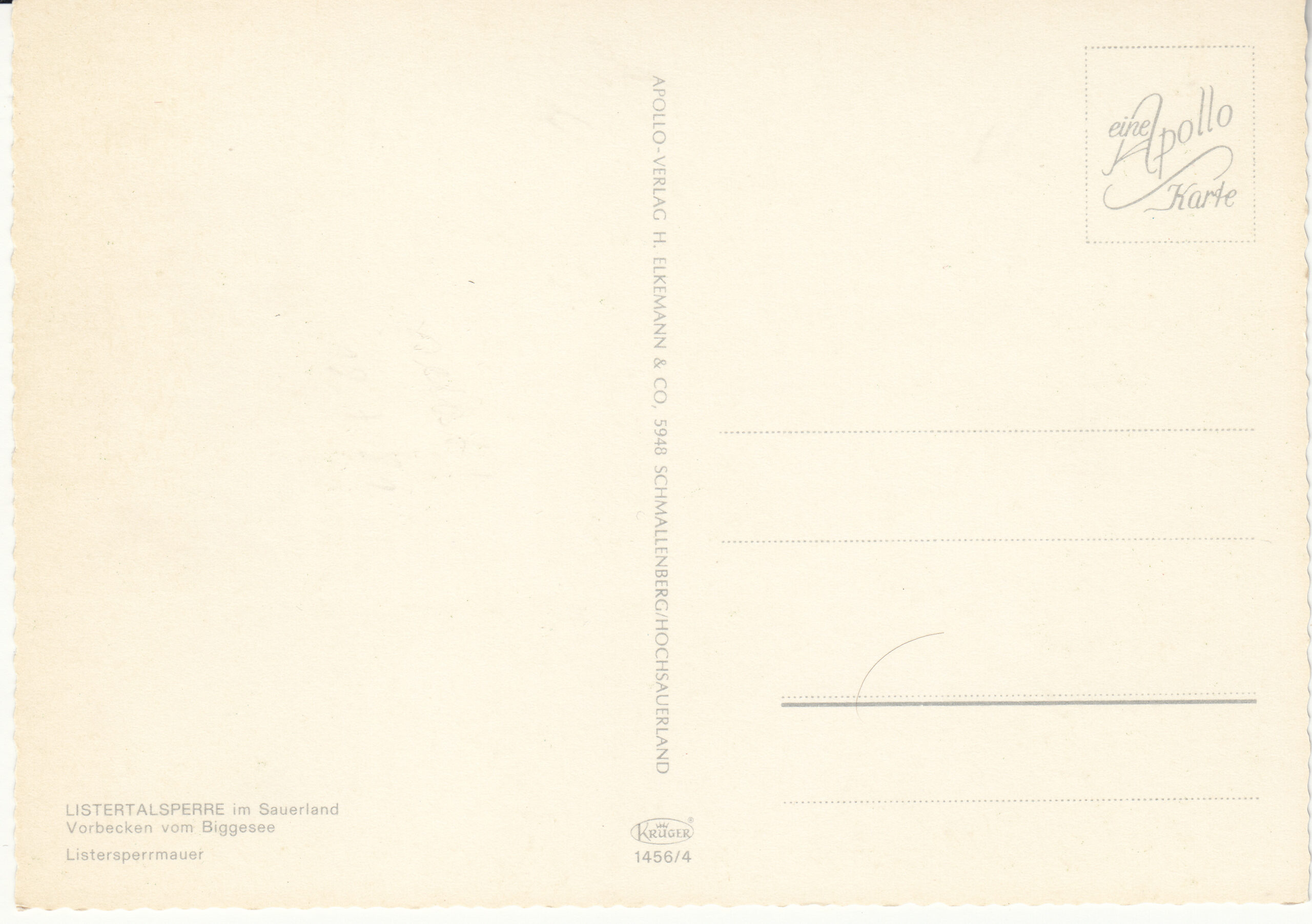 1.456- 4 Krüger Postcard Germany Listertalsperre